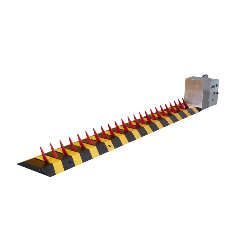 阻車器主要由翻轉(zhuǎn)體、機座組成(防撞齒釘可根據(jù)客戶需要調(diào)整高度)。整機為鋼結(jié)構(gòu),采用國標A3鋼板焊接而成,具有高強的承重和抗撞能力;機體內(nèi)無電器、無線路設置,防水、安全。該裝置埋設在車道上或大門的指定位置,通過值班人員的指令限制車輛通行。